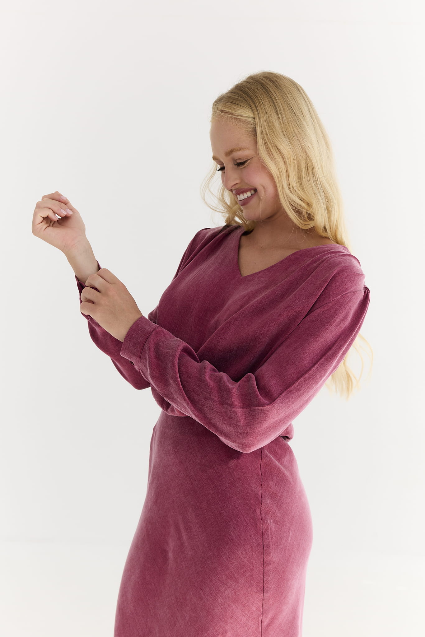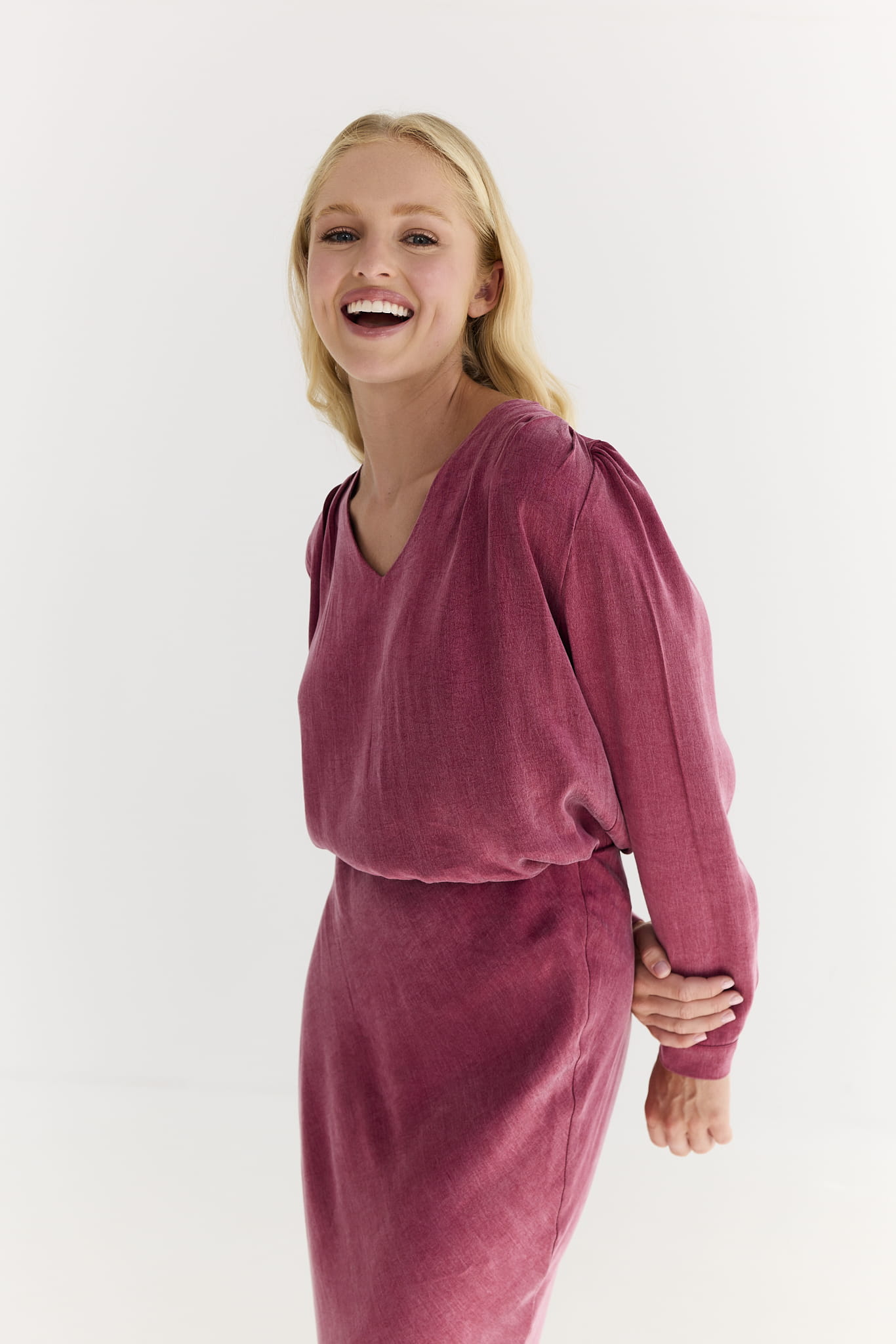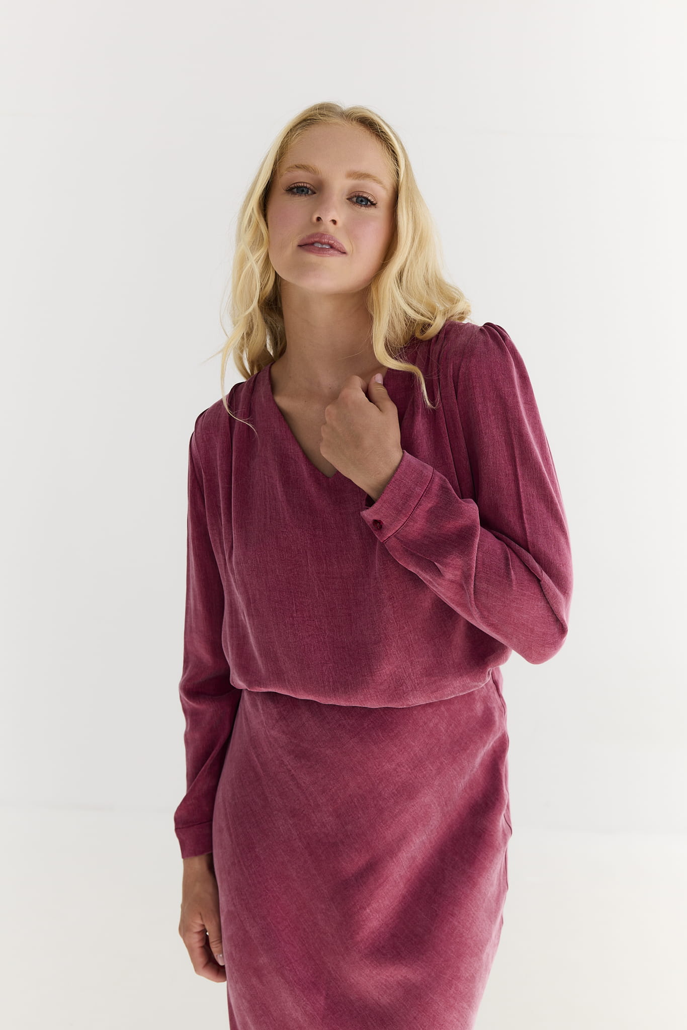Elegancja spotyka codzienny luz. Klasyczny, prosty krój uzupełniony o dekolt w serek tworzy kobiecą, wyrafinowaną linię, a subtelne marszczenia nadają całości delikatności i lekkości. To model, który łączy ponadczasową prostotę z detalem przyciągającym spojrzenia.