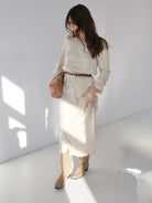 Collete to koszula, która łączy ponadczasową prostotę z subtelnym, kobiecym charakterem. Jej klasyczny krój został uzupełniony delikatnymi marszczeniami przy ramionach, które dodają sylwetce lekkości. Długie rękawy zakończone miękką gumką tworzą elegancki efekt dzwonka, a dekolt typu łódka subtelnie podkreśla linię szyi.