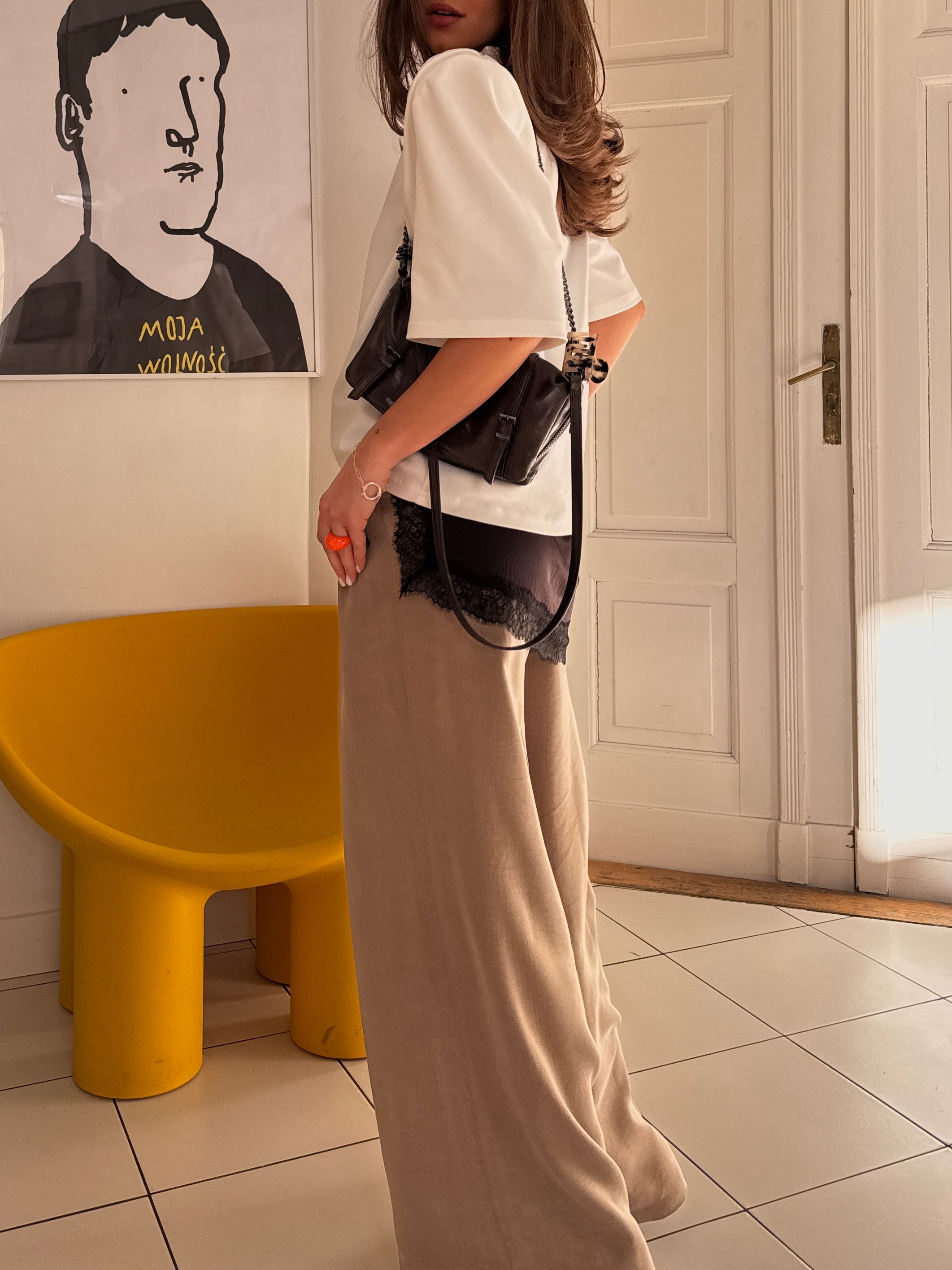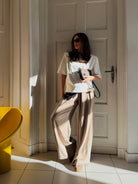 Uszyte z luksusowej tkaniny z wiskozy i lyocellu, spodnie zachwycają miękkością, subtelnym połyskiem i wysoką jakością wykończenia. Materiał o szlachetnej gramaturze pięknie układa się na sylwetce, utrzymuje formę i sprawia, że każdy ruch wygląda naturalnie i stylowo.