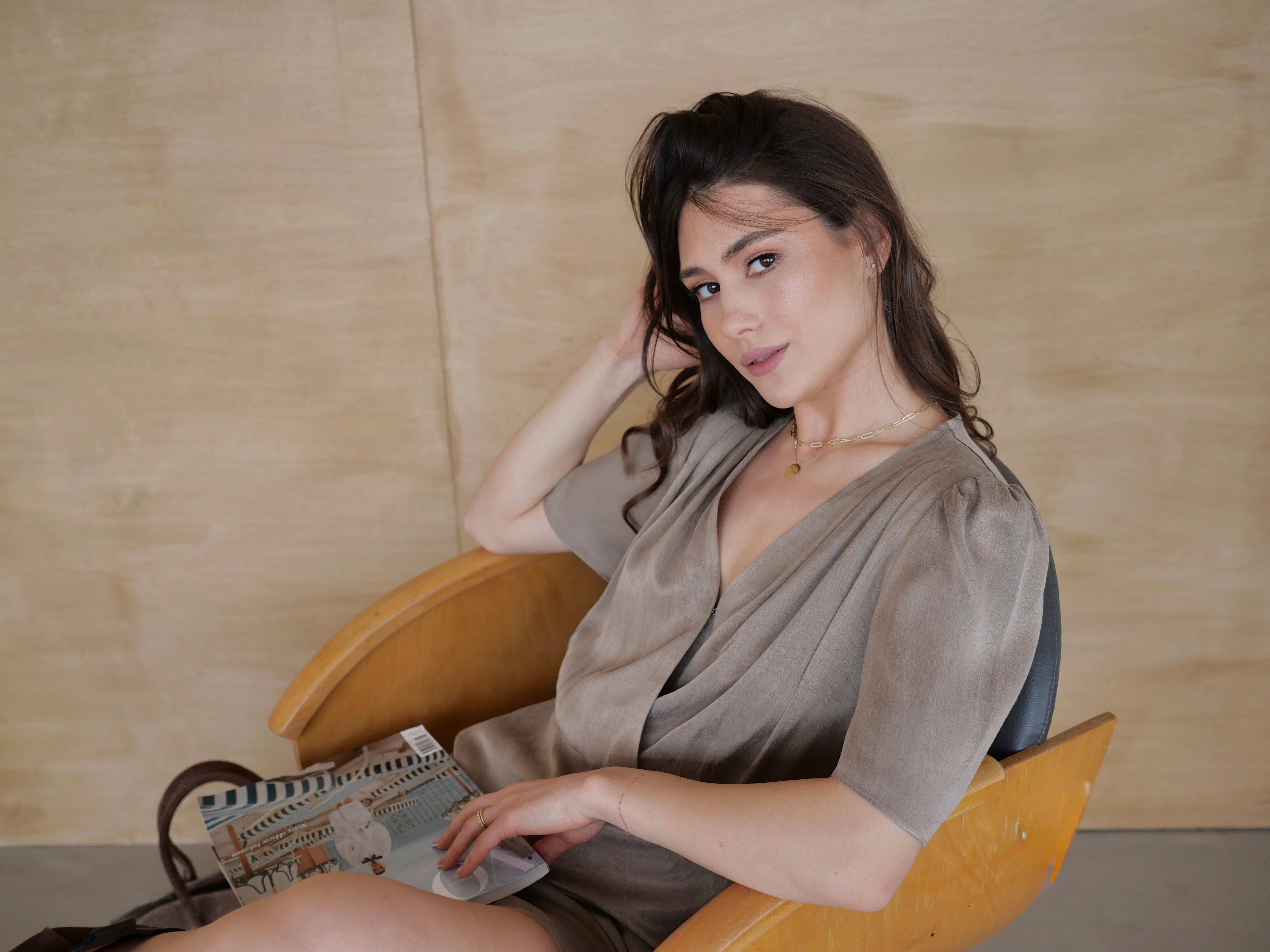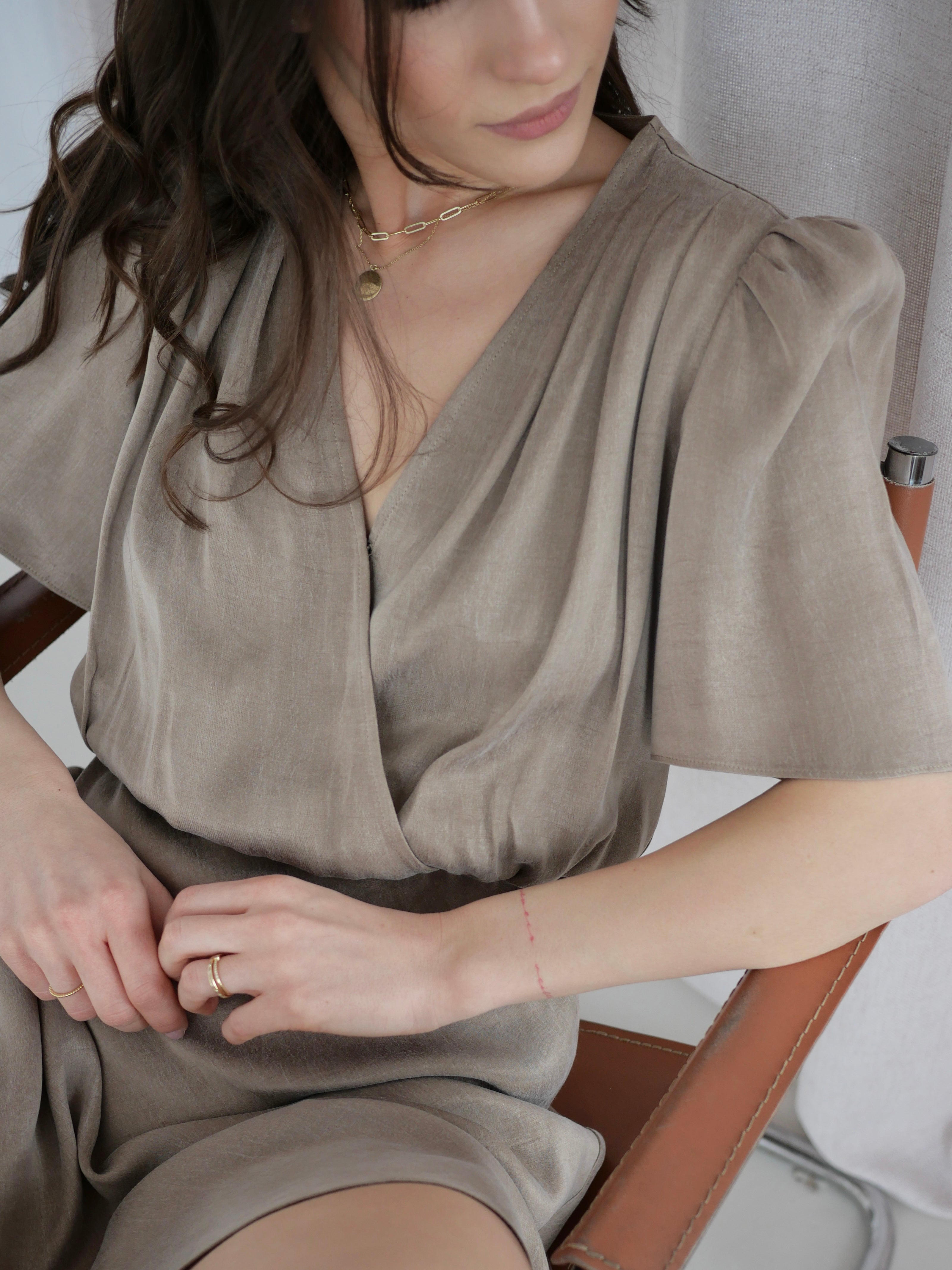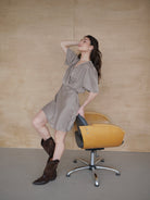 Model uszyty z miękkiej, płynącej tkaniny z dodatkiem lyocellu i wiskozy w odcieniu taupe - przyjemnej dla skóry i pięknie pracującej w ruchu. Sukienka wpisuje się w rytm codziennych momentów, łącząc delikatność z nowoczesną linią i minimalistyczną elegancją, charakterystyczną dla Story of now.