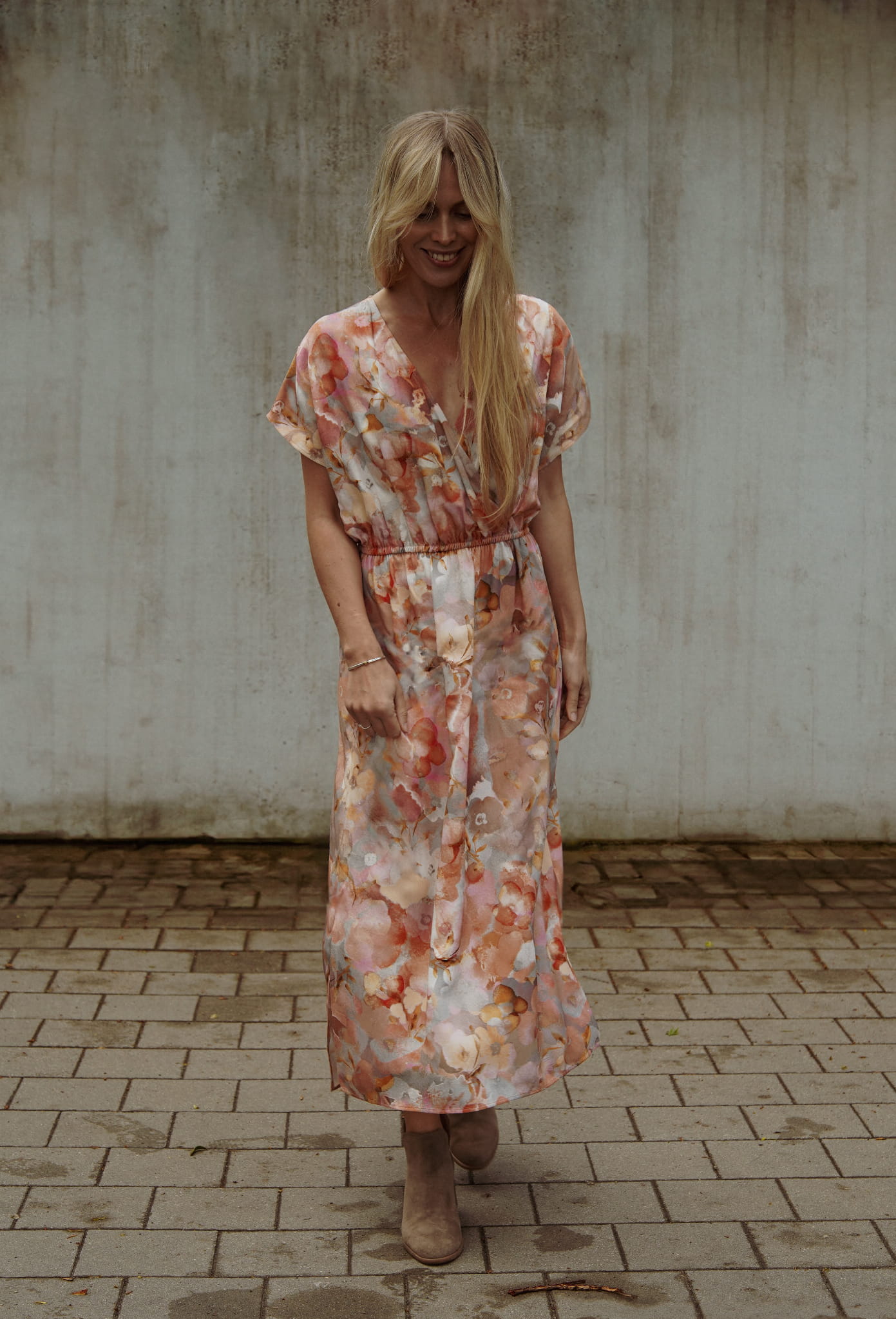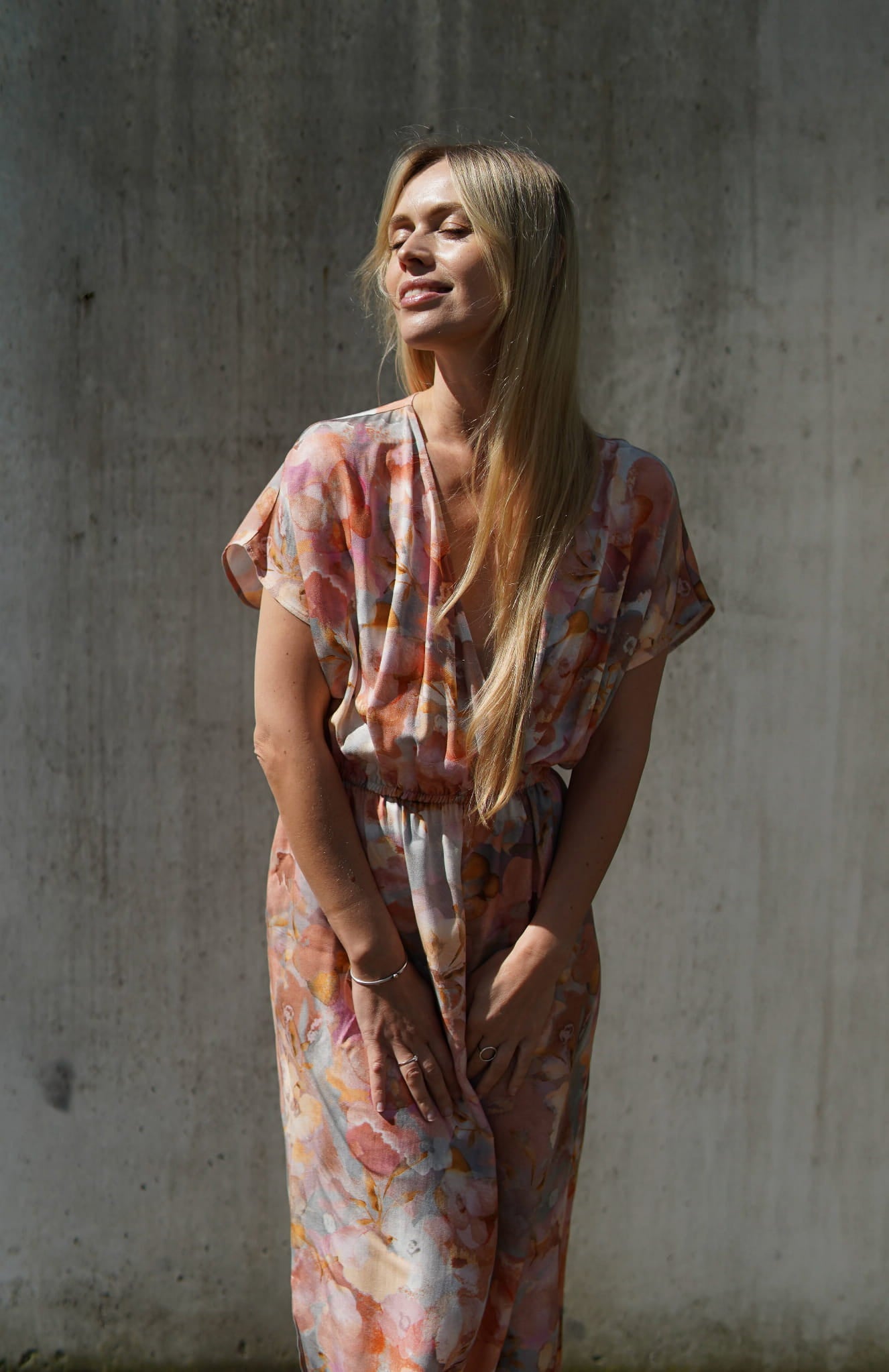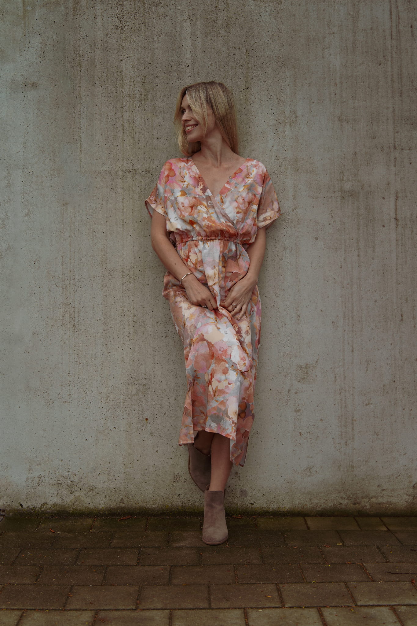 I AM ME dress to niezwykle kobieca i wygodna sukienka o długości MIDI. W pasie ma wszytą gumkę, dzięki której dobrze dopasowuje się do sylwetki. Dla wygody noszenia - ma dwa rozporki.