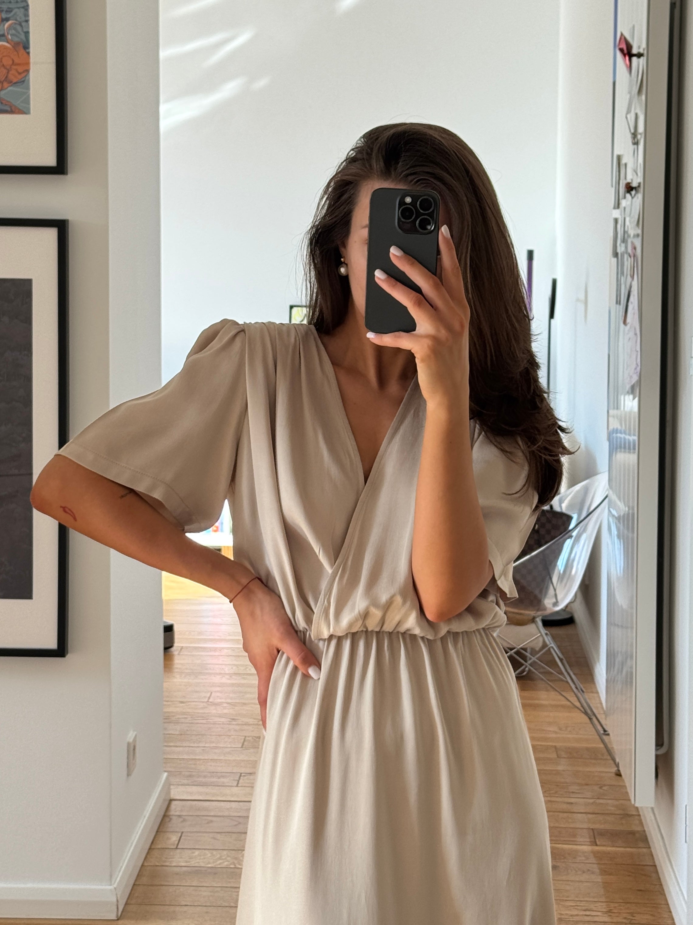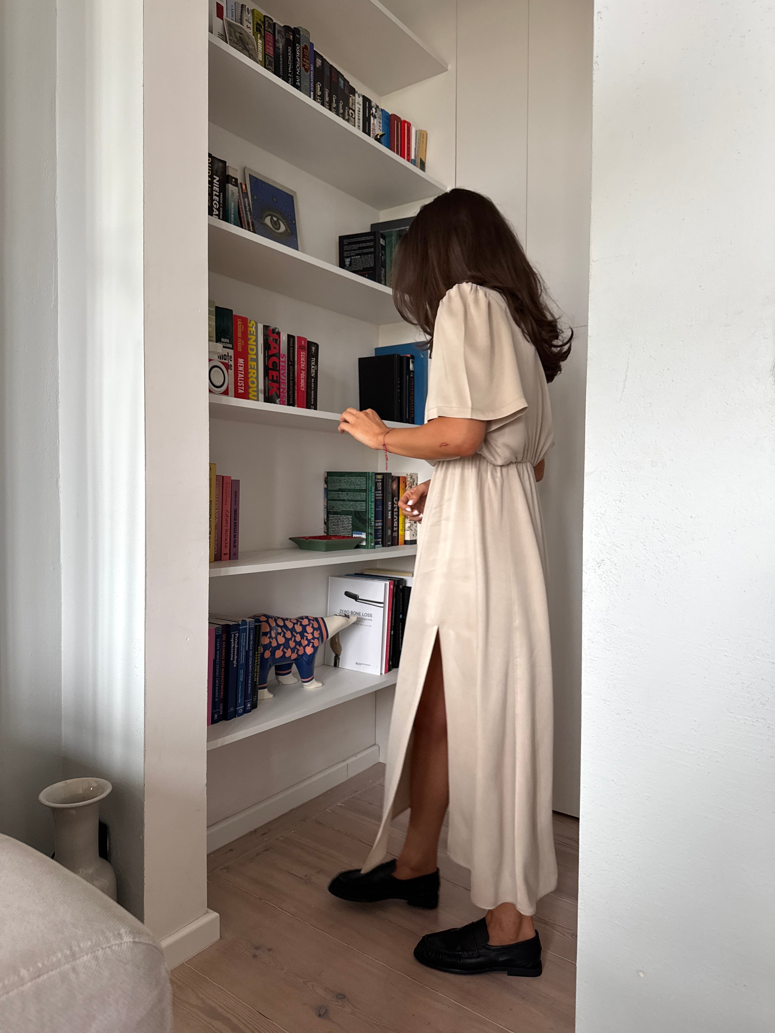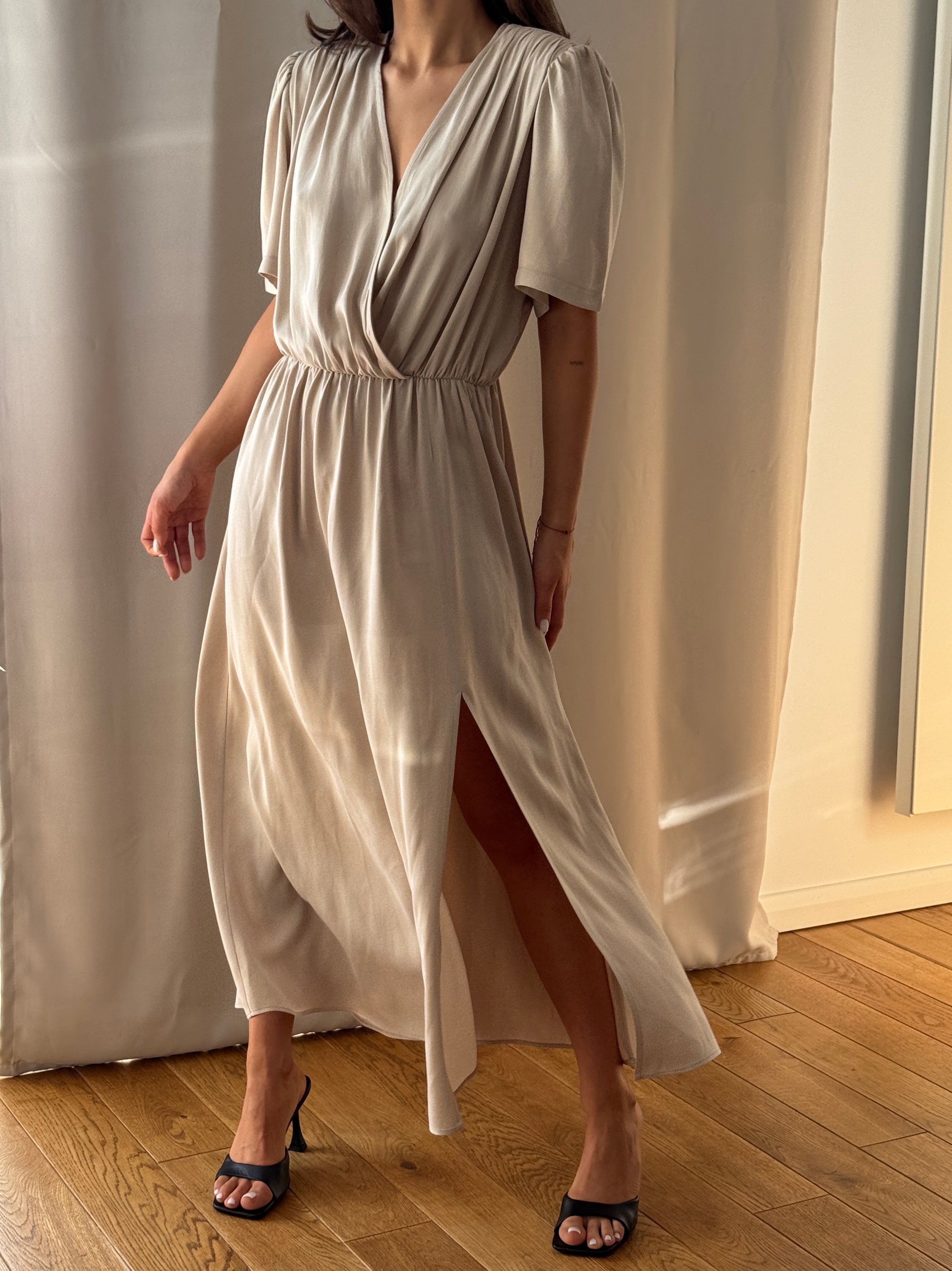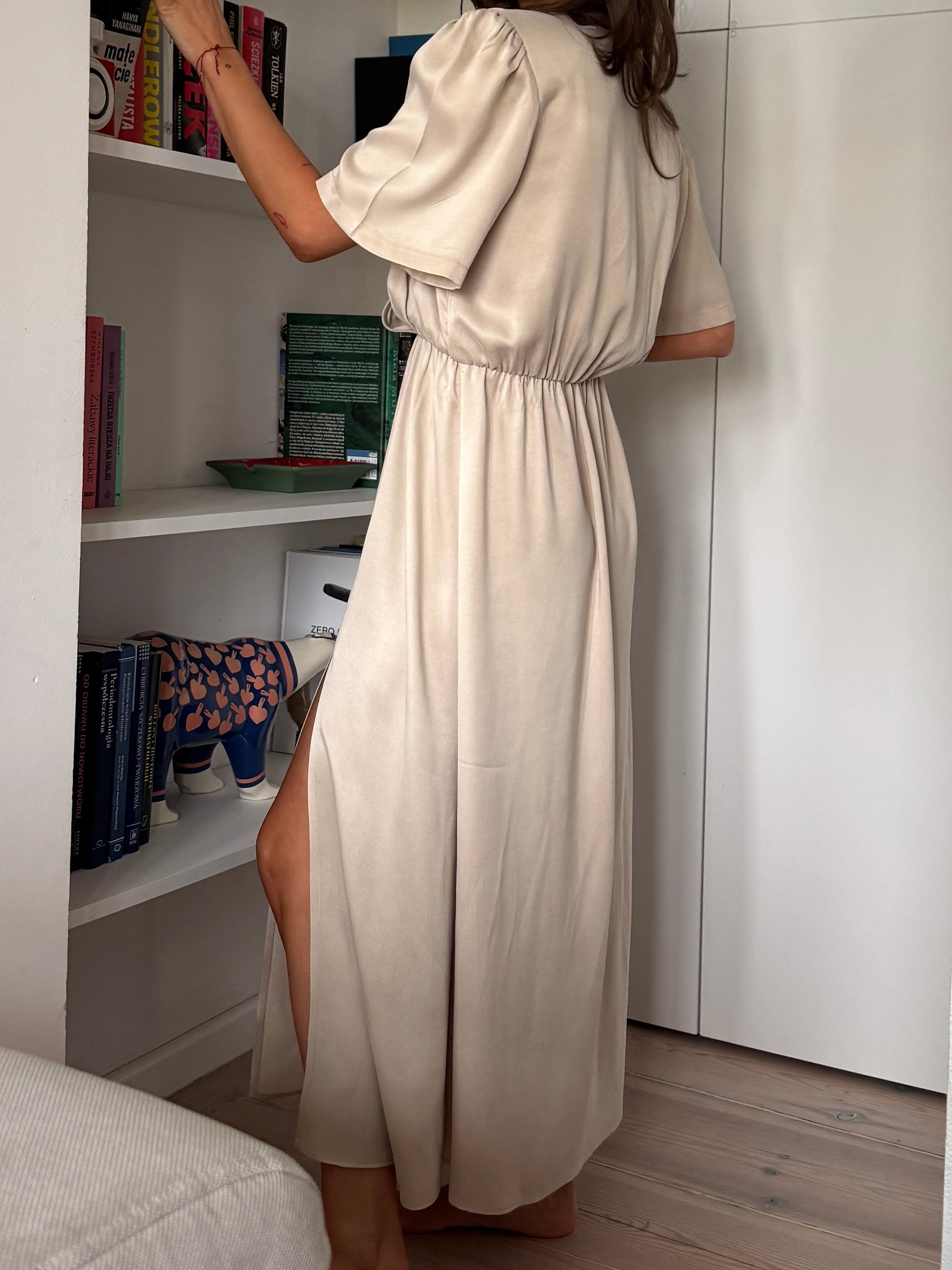 Dół o kroju A z rozporkiem zapewnia swobodę ruchu i buduje płynną, kobiecą linię. Krótki rękaw równoważy proporcje, a elastyczna talia gwarantuje komfortowe dopasowanie.