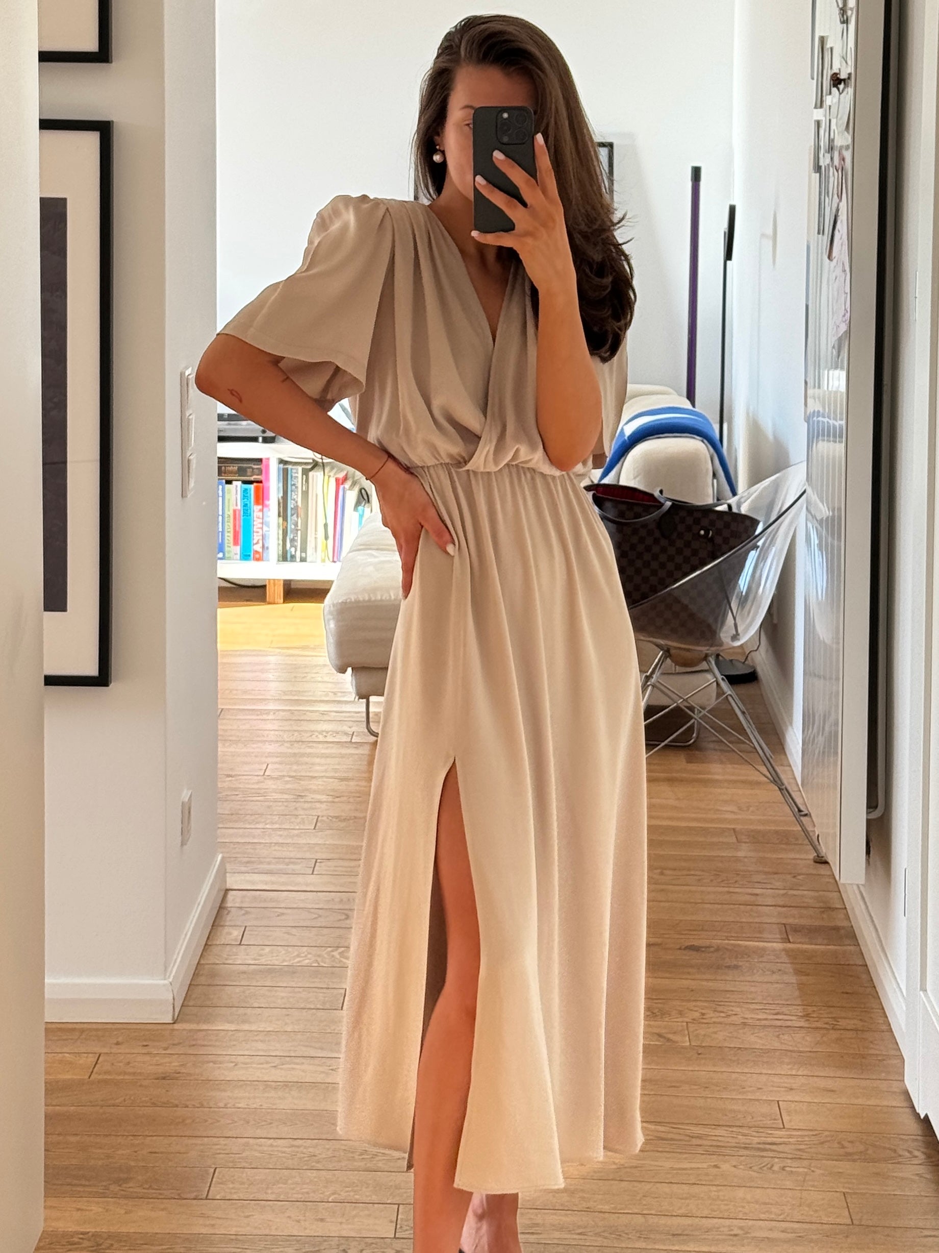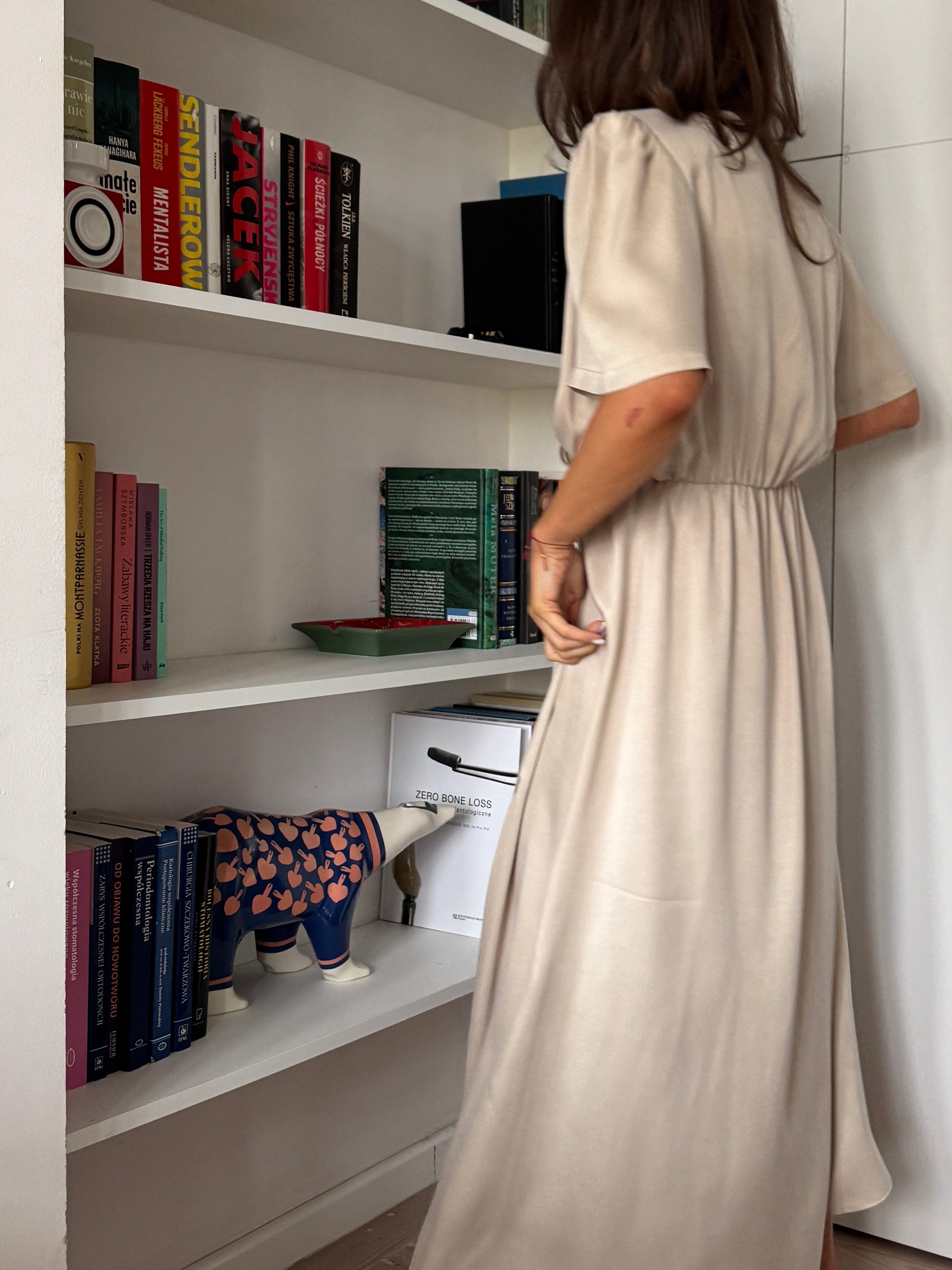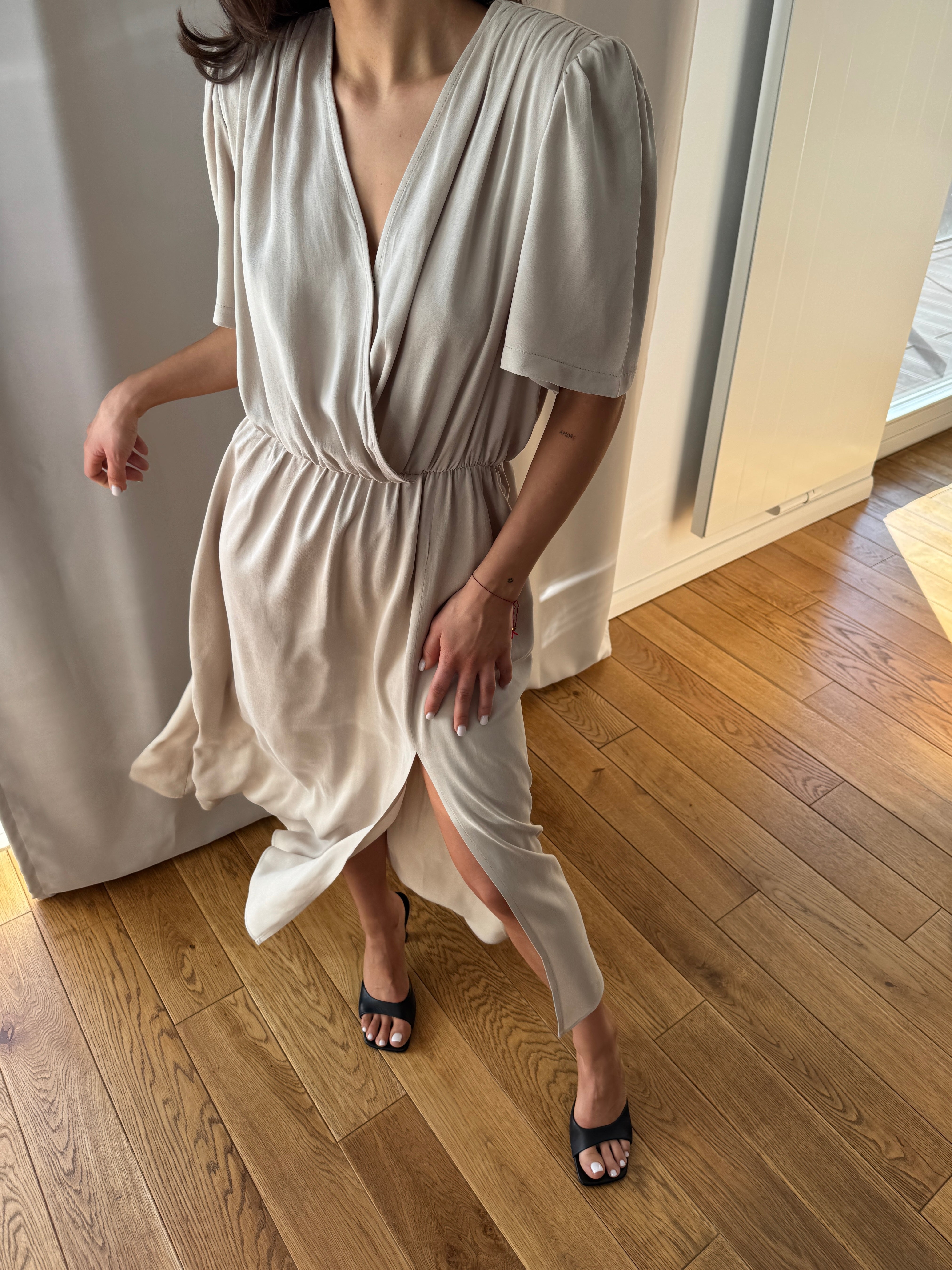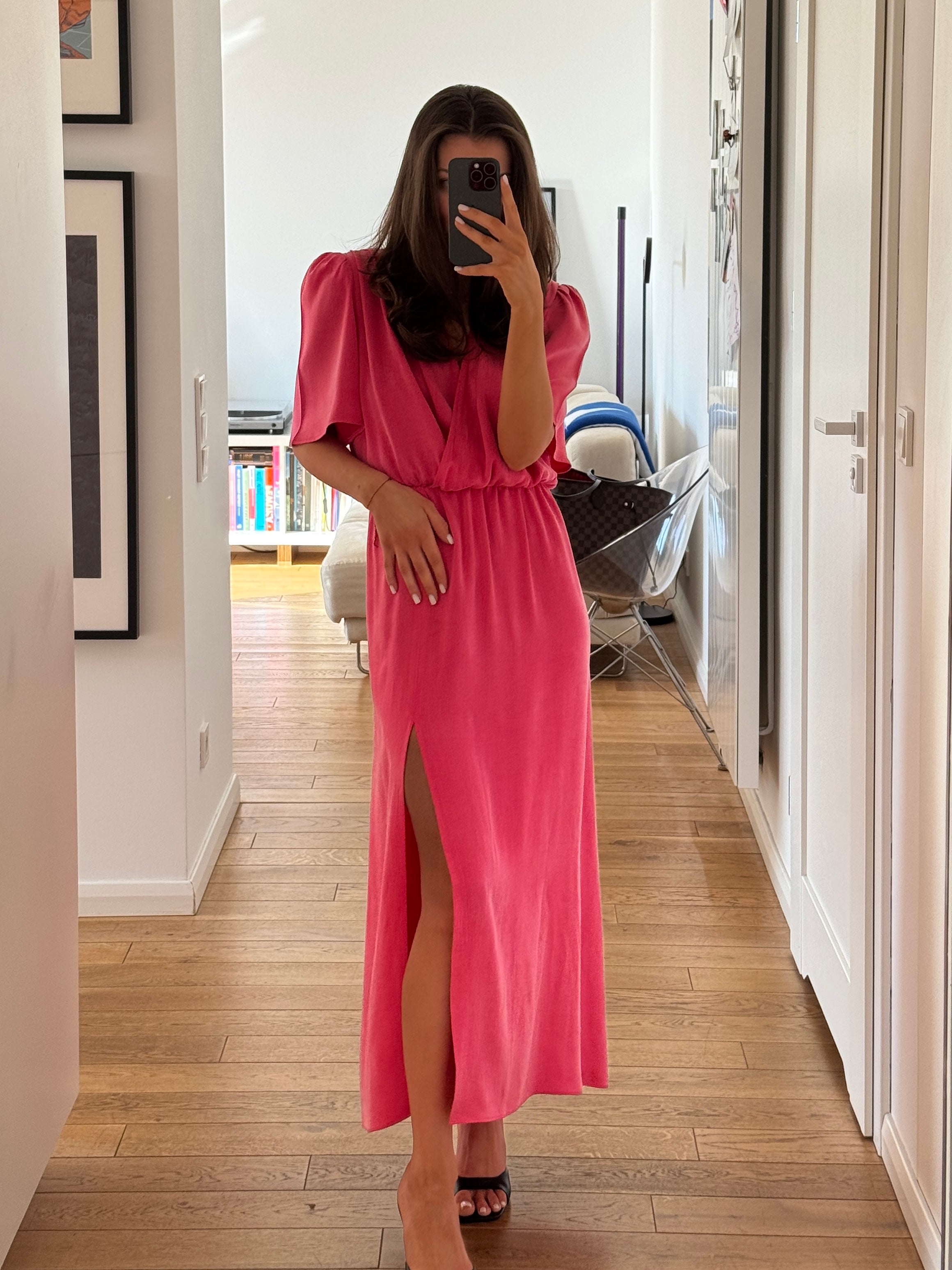 Dół o kroju A z rozporkiem zapewnia swobodę ruchu i buduje płynną, kobiecą linię. Krótki rękaw równoważy proporcje, a elastyczna talia gwarantuje komfortowe dopasowanie.