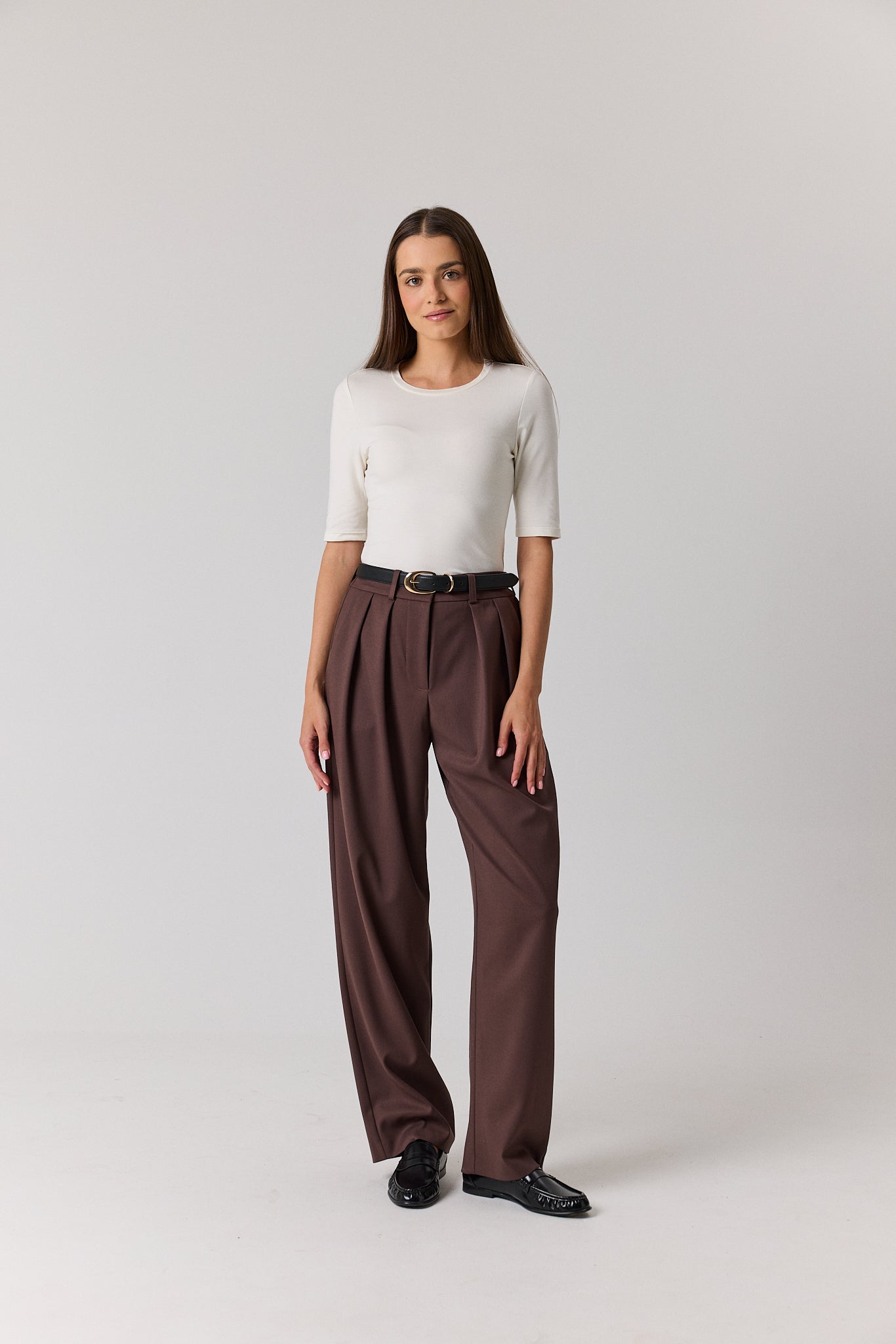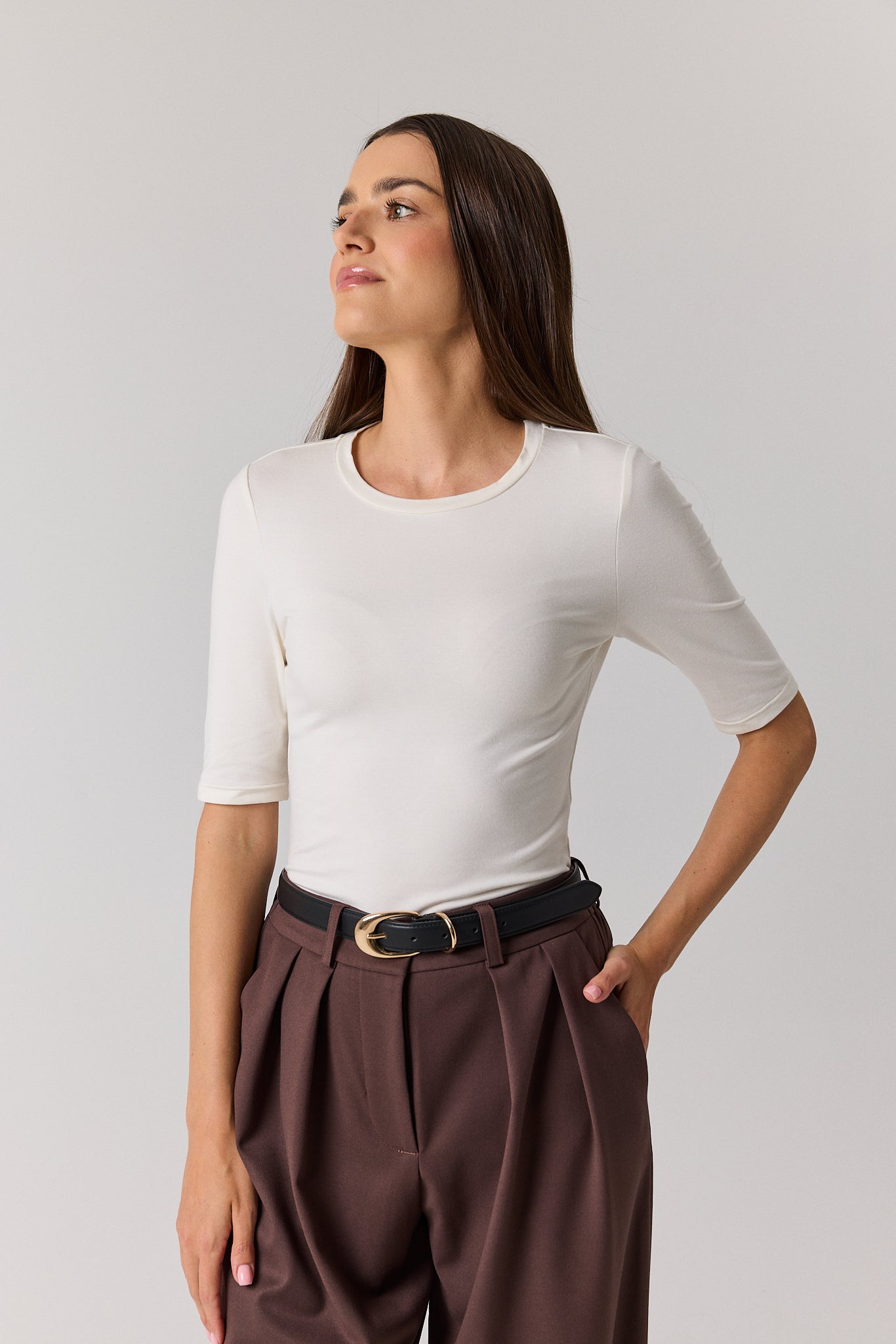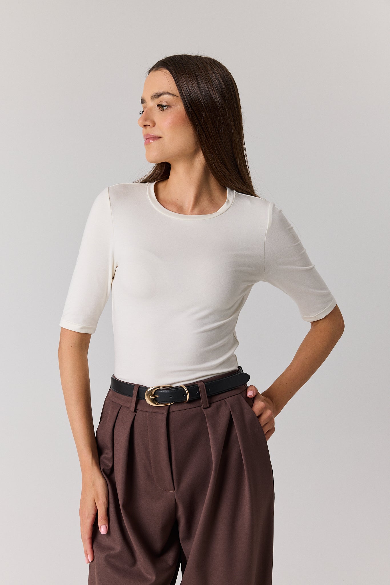 Wasz ulubiony element codziennej garderoby w nowym wydaniu. Klasyczna bluzka z krótkim rękawem łączy komfort noszenia z ponadczasowym stylem. Wykonana z miękkiej dzianiny z dodatkiem wełny, delikatnie otula skórę i zapewnia przyjemne ciepło przez cały dzień. Dopasowany krój subtelnie podkreśla sylwetkę, a minimalistyczny dekolt sprawia, że model świetnie sprawdza się zarówno solo, jak i w zestawieniach warstwowych. To uniwersalna baza, która wpasuje się w każdą stylizację – od casualowych zestawów z jeansami, po bardziej eleganckie looki z marynarką czy spódnicą.