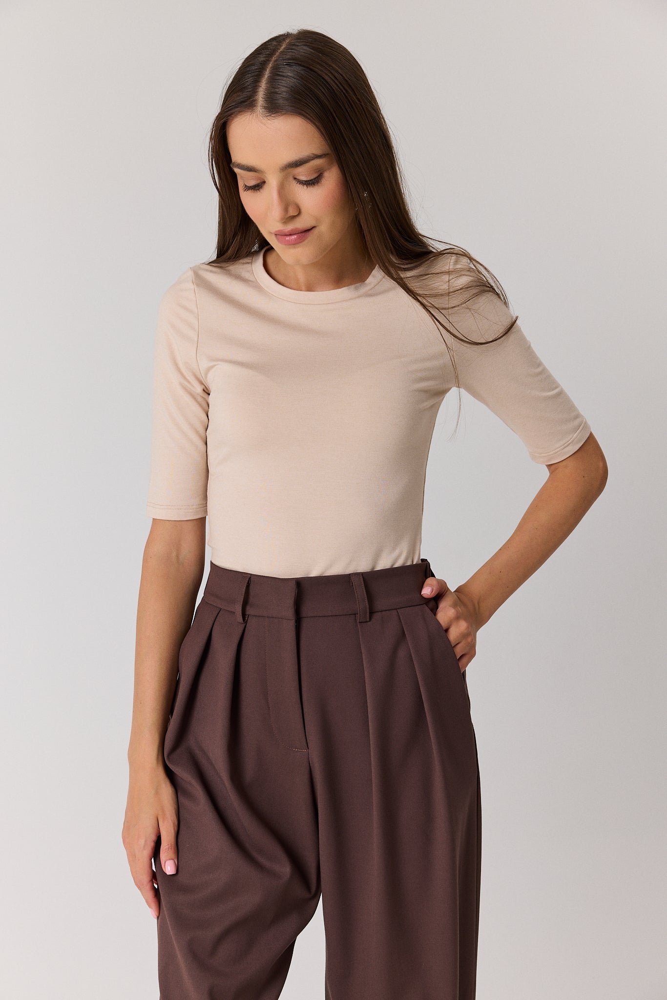 Wasz ulubiony element codziennej garderoby w nowym wydaniu. Klasyczna bluzka z krótkim rękawem łączy komfort noszenia z ponadczasowym stylem. Wykonana z miękkiej dzianiny z dodatkiem wełny, delikatnie otula skórę i zapewnia przyjemne ciepło przez cały dzień. Dopasowany krój subtelnie podkreśla sylwetkę, a minimalistyczny dekolt sprawia, że model świetnie sprawdza się zarówno solo, jak i w zestawieniach warstwowych. To uniwersalna baza, która wpasuje się w każdą stylizację – od casualowych zestawów z jeansami, po bardziej eleganckie looki z marynarką czy spódnicą.