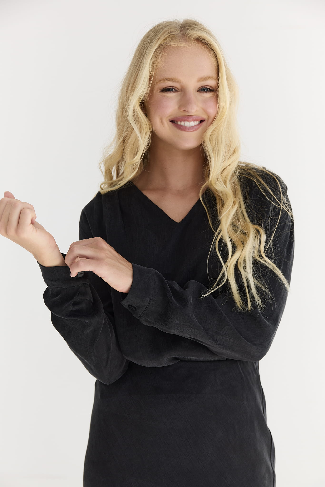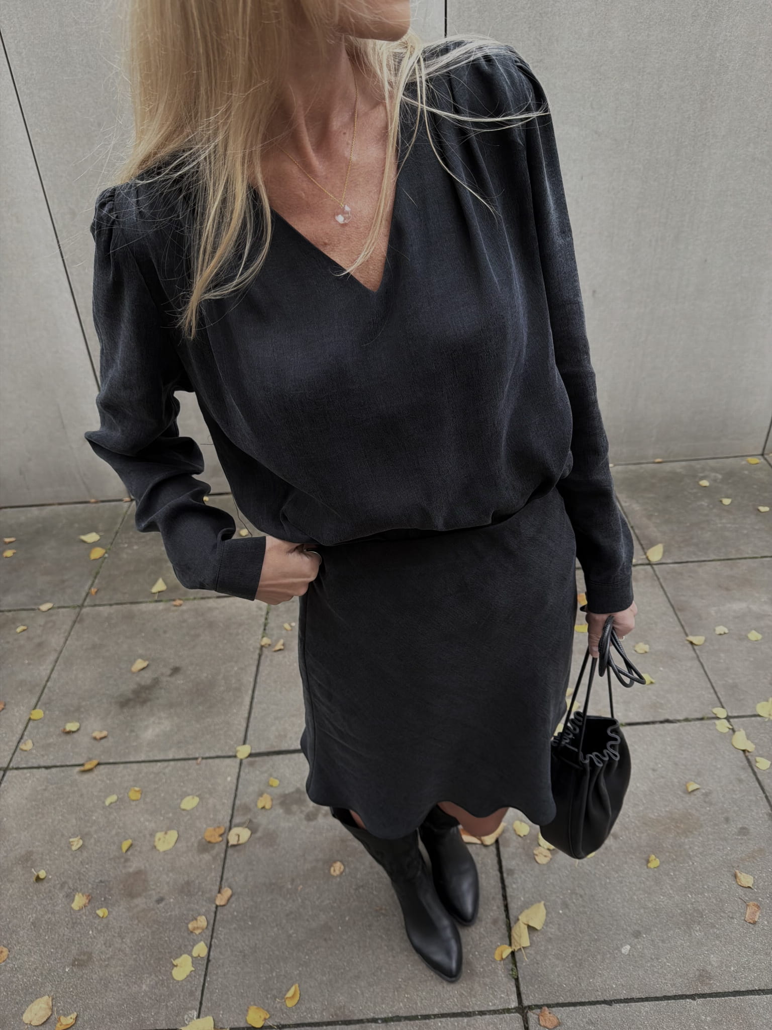 Elegancja spotyka codzienny luz. Klasyczny, prosty krój uzupełniony o dekolt w serek tworzy kobiecą, wyrafinowaną linię, a subtelne marszczenia nadają całości delikatności i lekkości. To model, który łączy ponadczasową prostotę z detalem przyciągającym spojrzenia.