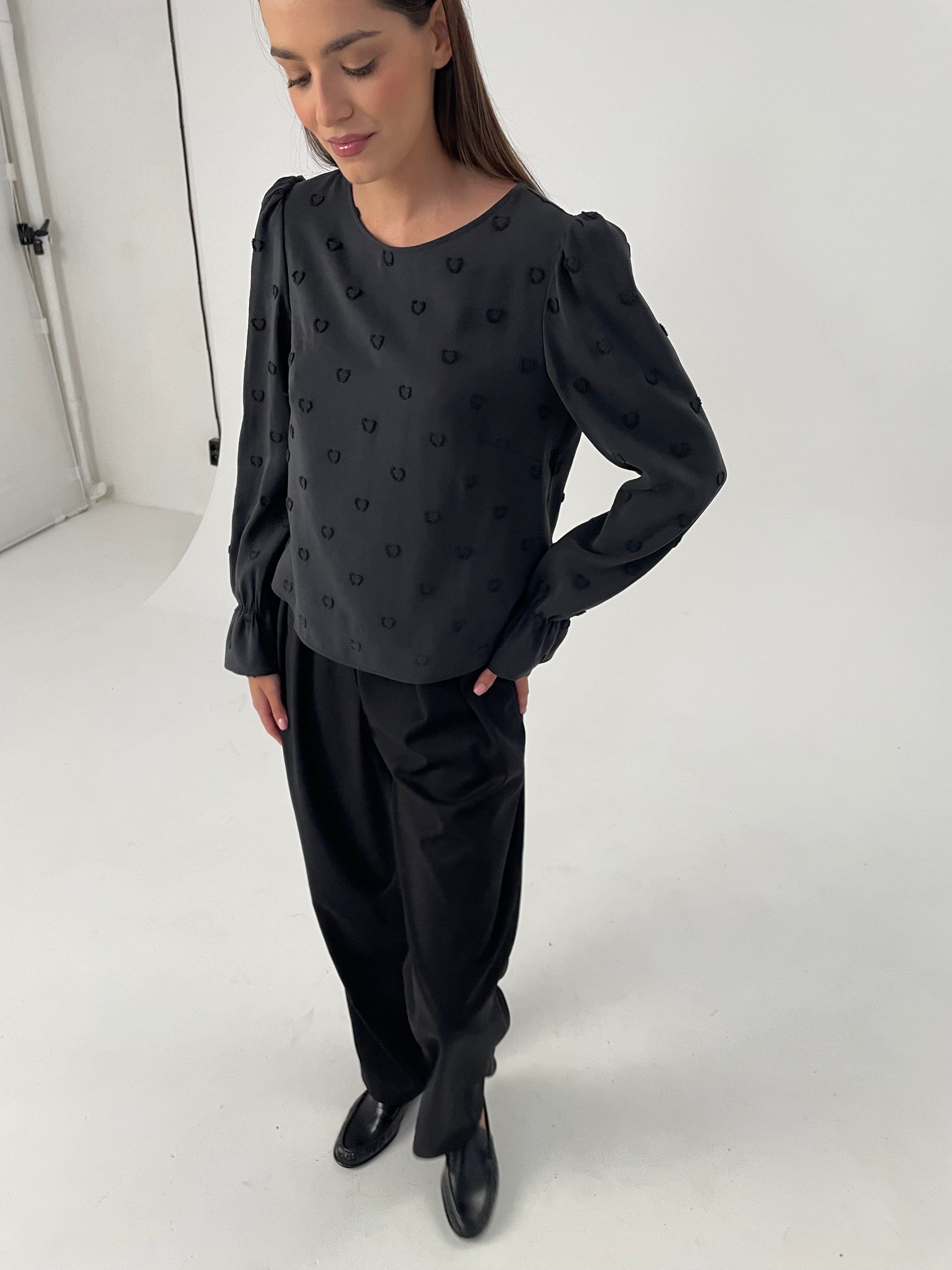 Uszyta z przepięknej tkaniny, z wyszywanymi sercami. Gładko układa się na ciele, zapewniając wygodę przez cały dzień i miękkość charakterystyczną dla premium. Kolor black nadaje jej wyrazistości i elegancji, tworząc idealny balans między klasyką a nowoczesnością.