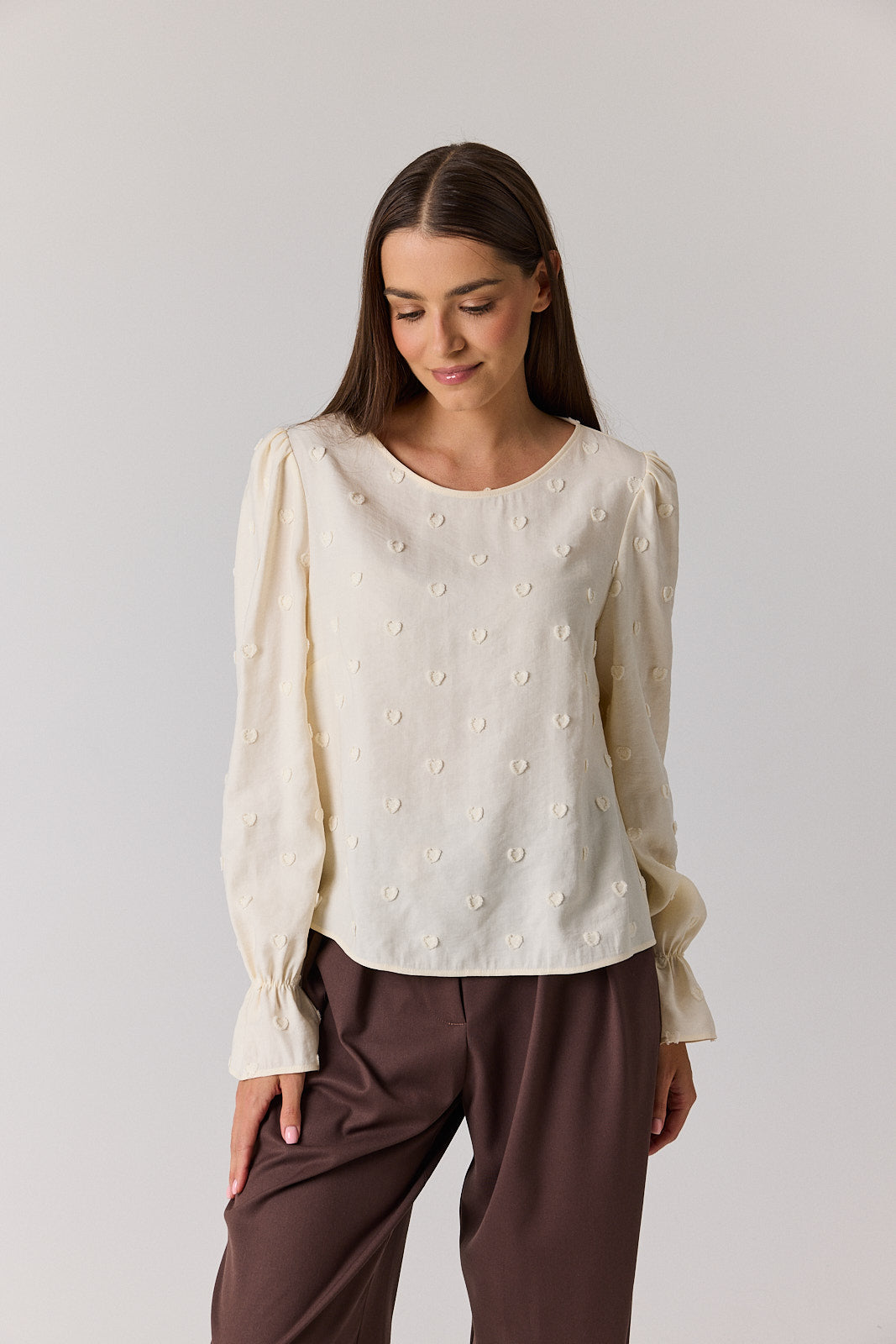 Collete to koszula, która łączy ponadczasową prostotę z subtelnym, kobiecym charakterem. Jej klasyczny krój został uzupełniony delikatnymi marszczeniami przy ramionach, które dodają sylwetce lekkości. Długie rękawy zakończone miękką gumką tworzą elegancki efekt dzwonka, a dekolt typu łódka subtelnie podkreśla linię szyi.