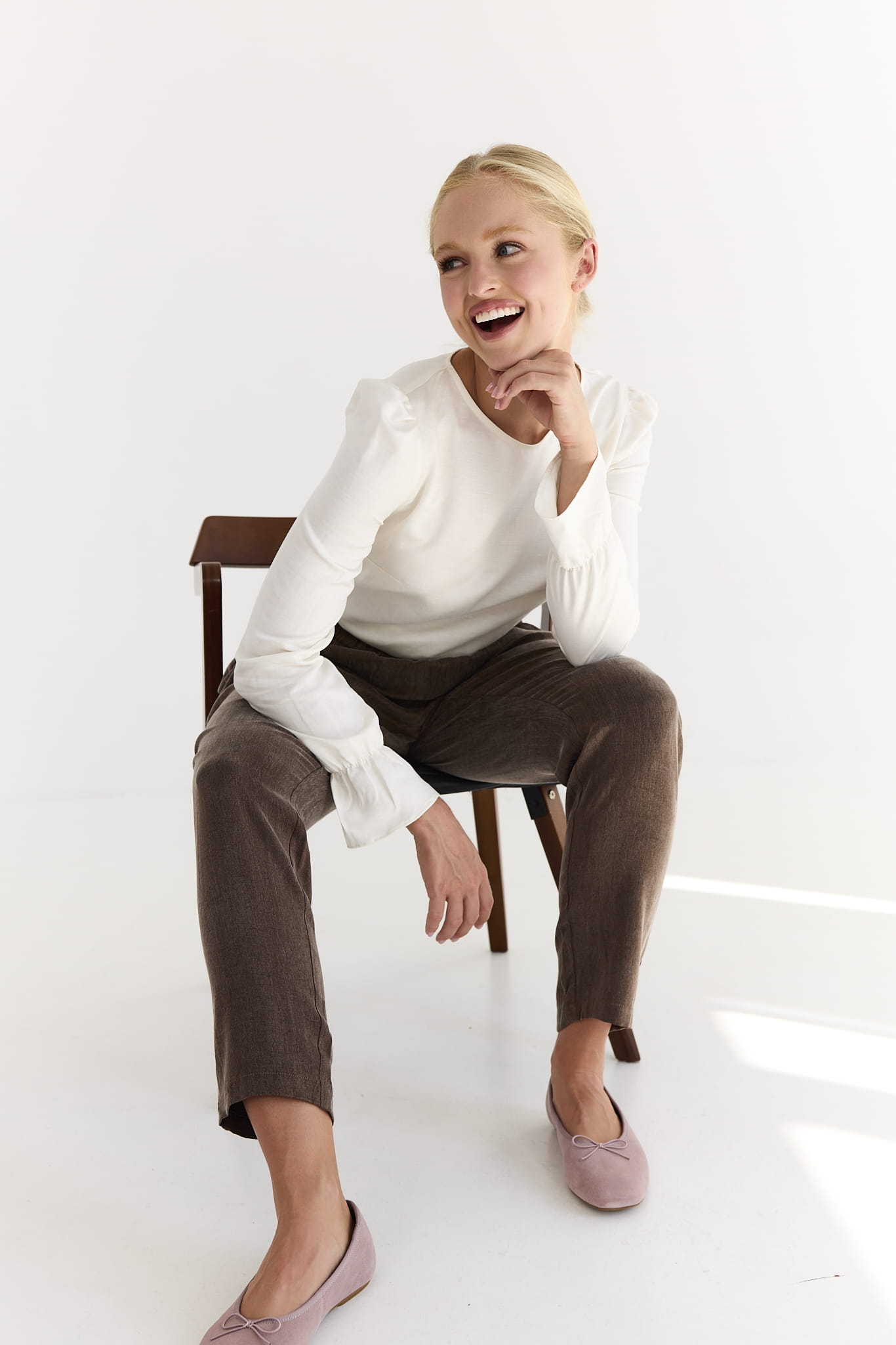 Collete to koszula, która łączy ponadczasową prostotę z subtelnym, kobiecym charakterem. Jej klasyczny krój został uzupełniony delikatnymi marszczeniami przy ramionach, które dodają sylwetce lekkości. Długie rękawy zakończone miękką gumką tworzą elegancki efekt dzwonka, a dekolt typu łódka subtelnie podkreśla linię szyi.