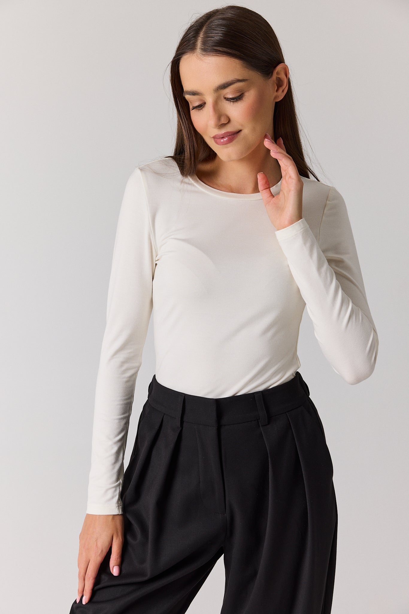 Wasz ulubiony element codziennej garderoby w nowym wydaniu. Longsleeve z długim rękawem łączy komfort noszenia z ponadczasowym stylem. Wykonany z miękkiej dzianiny z dodatkiem wełny, delikatnie otula skórę i zapewnia przyjemne ciepło przez cały dzień. Dopasowany krój subtelnie podkreśla sylwetkę, a minimalistyczny dekolt sprawia, że model świetnie sprawdza się zarówno solo, jak i w zestawieniach warstwowych. To uniwersalna baza, która wpasuje się w każdą stylizację – od casualowych zestawów z jeansami, po bardziej eleganckie looki z marynarką czy spódnicą.