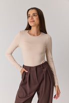 Wasz ulubiony element codziennej garderoby w nowym wydaniu. Longsleeve z długim rękawem łączy komfort noszenia z ponadczasowym stylem. Wykonany z miękkiej dzianiny z dodatkiem wełny, delikatnie otula skórę i zapewnia przyjemne ciepło przez cały dzień. Dopasowany krój subtelnie podkreśla sylwetkę, a minimalistyczny dekolt sprawia, że model świetnie sprawdza się zarówno solo, jak i w zestawieniach warstwowych. To uniwersalna baza, która wpasuje się w każdą stylizację – od casualowych zestawów z jeansami, po bardziej eleganckie looki z marynarką czy spódnicą.