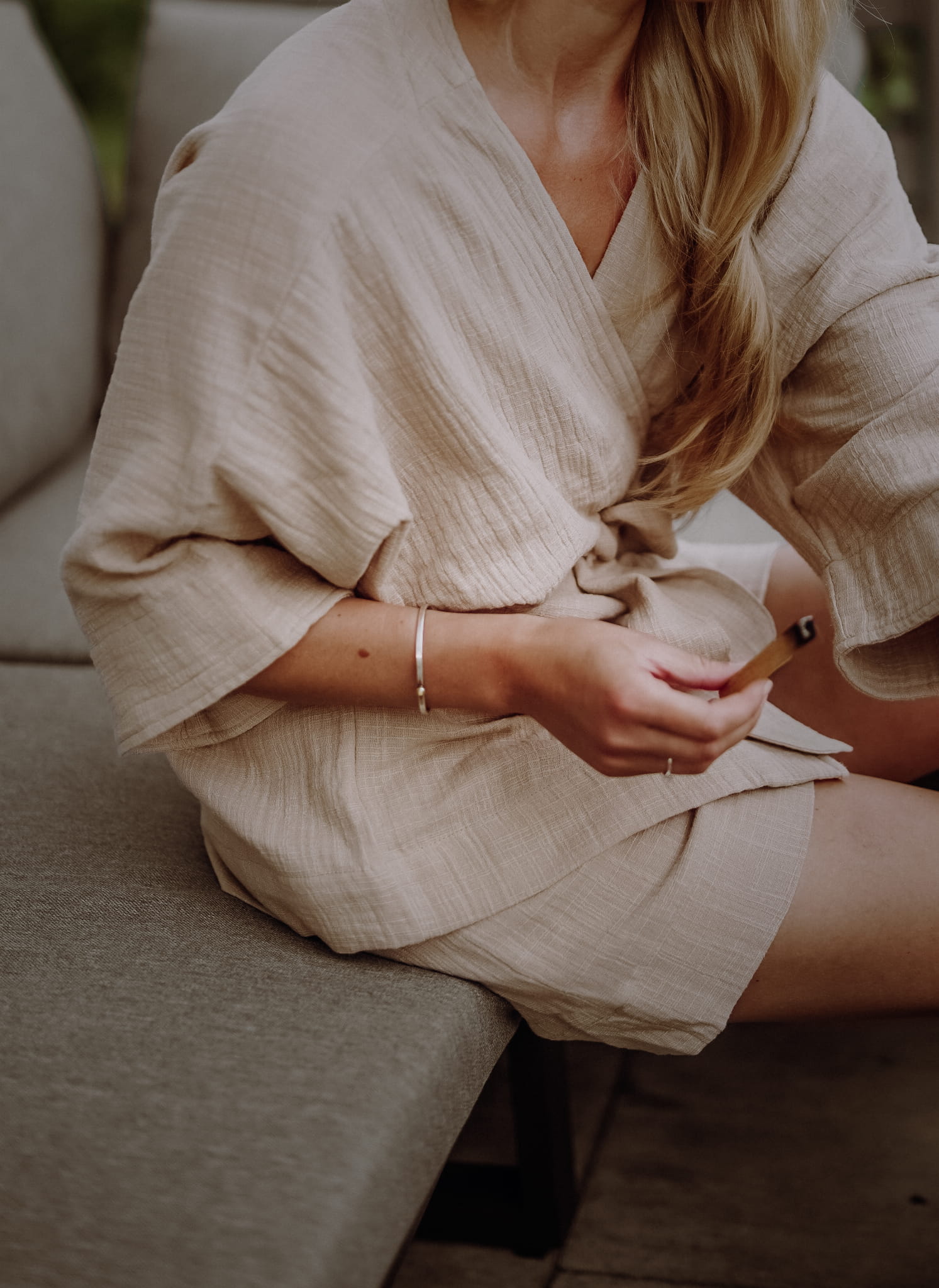 Set COMFI - kimono i spodenki to odpowiedź na Twoją potrzebę, żeby zadbać o siebie przede wszystkim w domu - dla siebie, dla bliskich i cieszyć się swoją codziennością bycia tu i teraz. Zestaw COMFI łączy sobie prostotę, komfort jak i uniwersalność. Dzięki swojej wygodzie pozwoli Ci na zadbanie o siebie w domu, ale także latem sprawdzi się na wymarzonej randce i spotkaniu z przyjaciółmi. Będzie wprost idealny na casualowe okazje, wypady z bliskimi, spotkania na mieście, jak i wyjścia w plener czy na plażę.