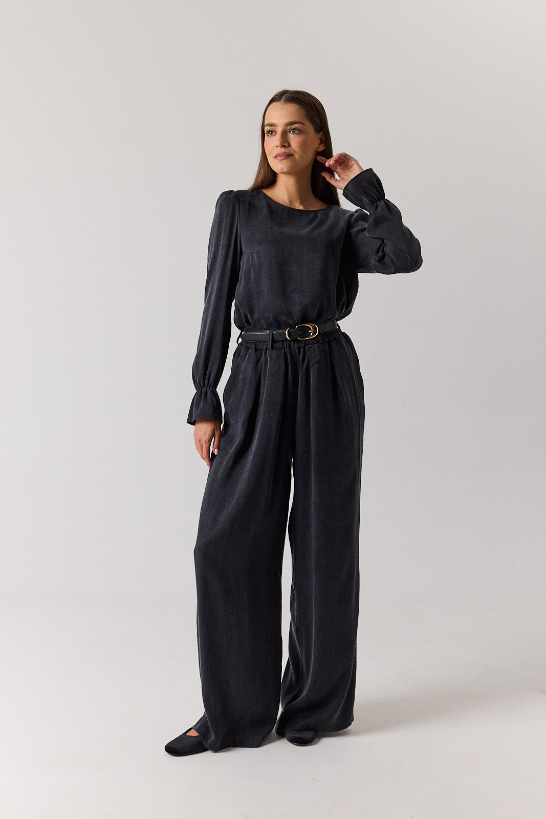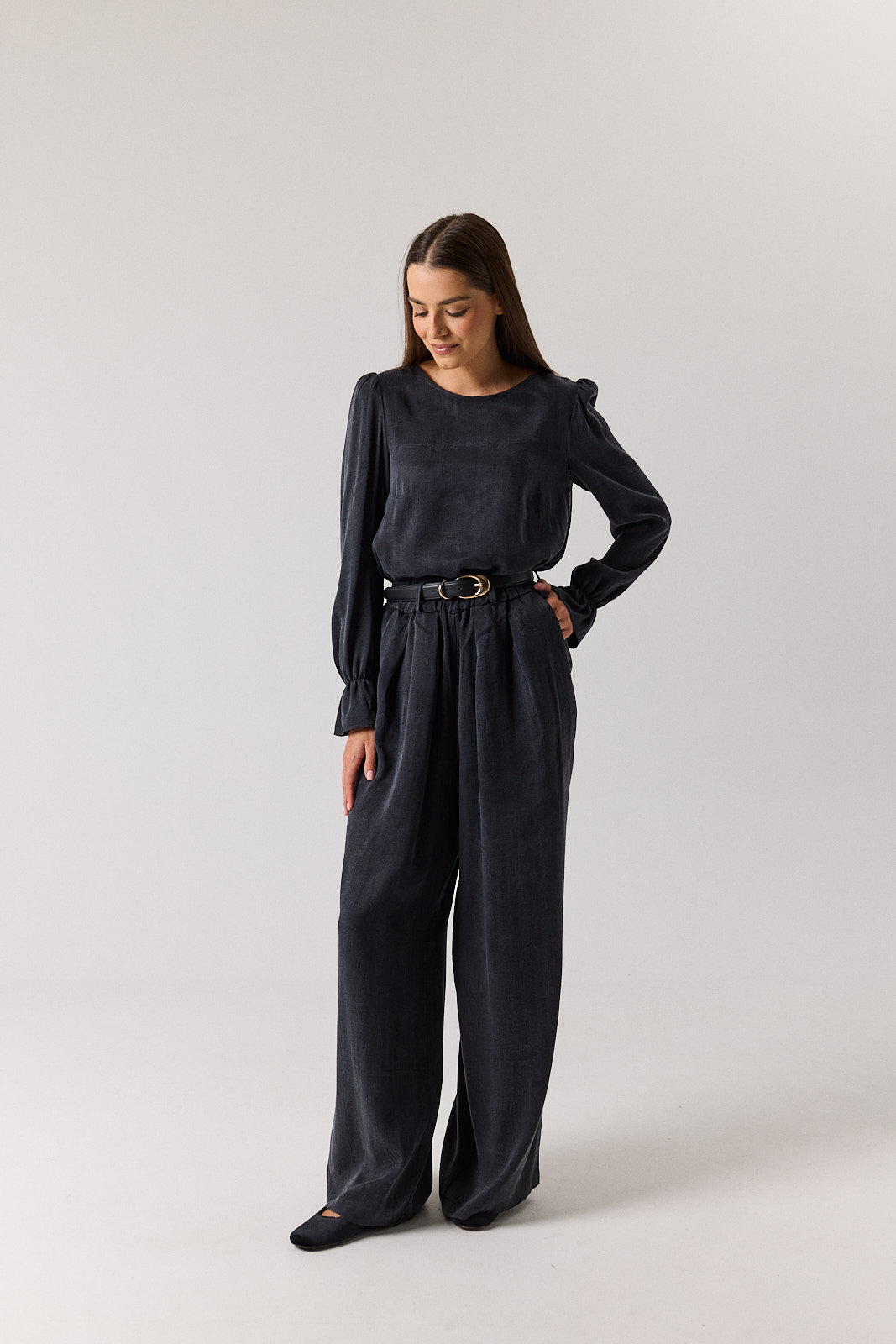 Uszyte z luksusowej tkaniny z wiskozy i lyocellu, spodnie zachwycają miękkością, subtelnym połyskiem i wysoką jakością wykończenia. Materiał o szlachetnej gramaturze pięknie układa się na sylwetce, utrzymuje formę i sprawia, że każdy ruch wygląda naturalnie i stylowo.