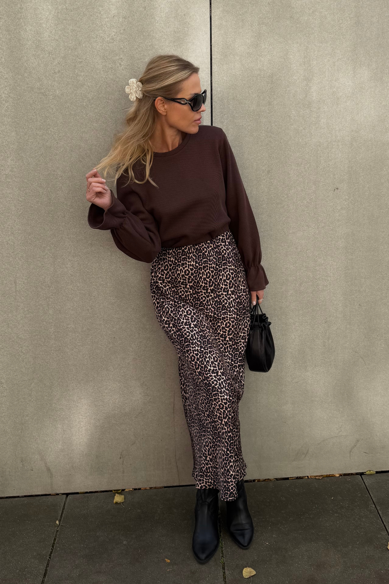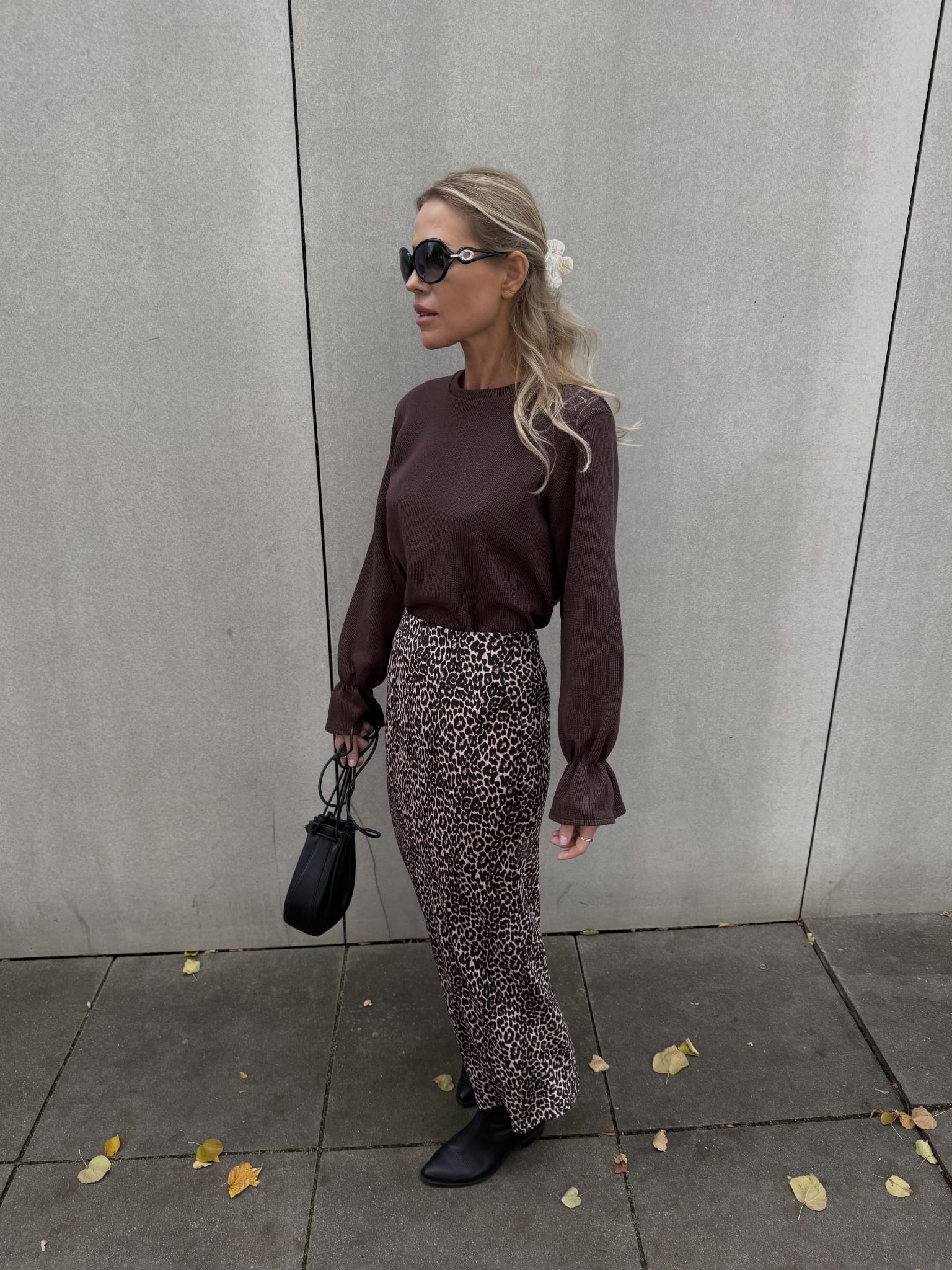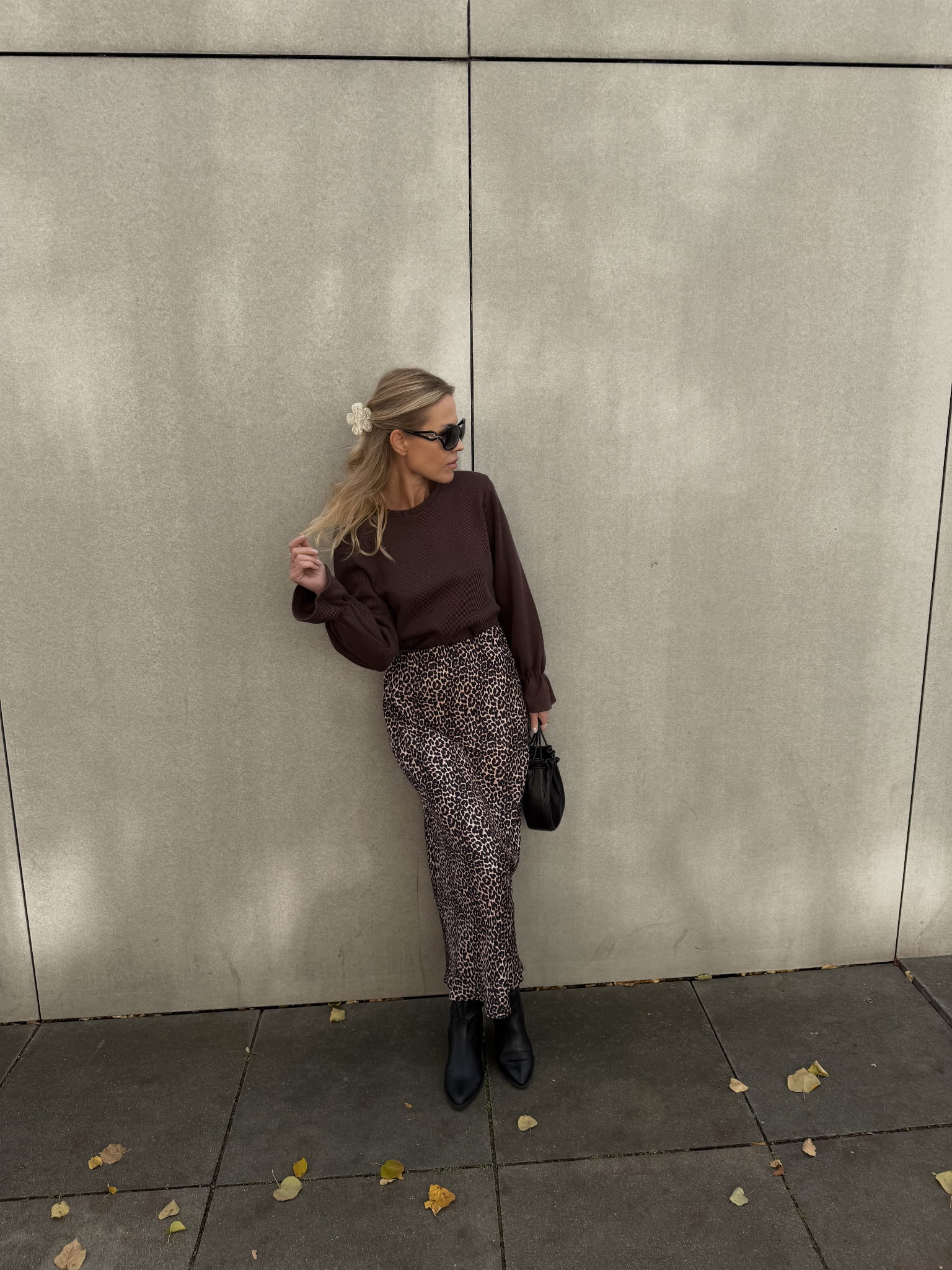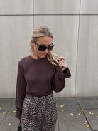 Luźny, ponadczasowy fason z subtelnie opuszczoną linią ramion – sweter, który łączy klasykę z nowoczesnym wyczuciem stylu. Delikatne wykończenie przy dekolcie i rękawach nadaje mu lekkości, a miękka linia kroju pięknie układa się na sylwetce, podkreślając jej naturalny ruch.