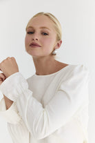 Klasyczny, prosty krój w połączeniu z subtelnymi marszczeniami przy ramionach – koszula, która łączy ponadczasową formę z wyrafinowanym detalem. Długie rękawy zakończone delikatnym dzwonkiem nadają sylwetce lekkości, a dekolt typu łódka subtelnie podkreśla linię szyi.