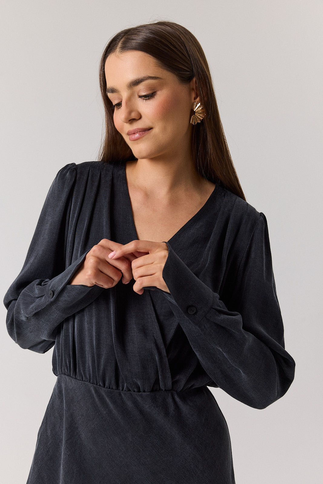 SUKIENKA MOMENTÉ MIDI to esencja współczesnej elegancji – stworzona z myślą o chwilach, które chcemy celebrować. Subtelnie układa się na sylwetce, podkreślając jej linię, a modne drapowanie na górze nadaje sukience lekkości i dynamiki. Dekoracyjna zapinka przy dekolcie dodaje szykownego akcentu, a długie, eleganckie mankiety wysmuklają dłonie. Subtelnie podkreślone ramiona tworzą harmonijną proporcję sylwetki.