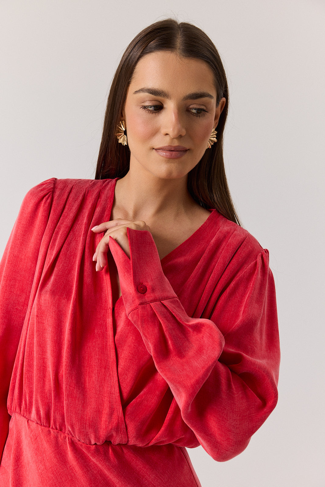 SUKIENKA MOMENTÉ MINI to esencja współczesnej elegancji – stworzona z myślą o chwilach, które chcemy celebrować. Subtelnie układa się na sylwetce, podkreślając jej linię, a modne drapowanie na górze nadaje sukience lekkości i dynamiki. Dekoracyjna zapinka przy dekolcie dodaje szykownego akcentu, a długie, eleganckie mankiety wysmuklają dłonie. Subtelnie podkreślone ramiona tworzą harmonijną proporcję sylwetki.